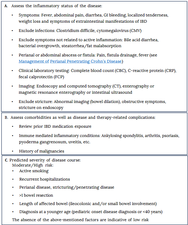 Highlight Box Therapy decisions are based on anatomic location of disease, severity of disease, disease complications, extra-intestinal manifestations of the disease, other comorbidities, and patient preference. Treatment goals include induction and maintenance of remission. New therapies are constantly being developed and should be considered.